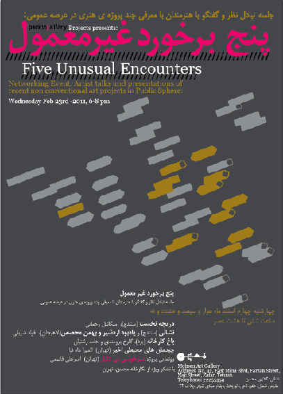 جلسه گفتگو با هنرمندان با معرفي چند پروژه هنري در عرصه عمومي ، امروز ـ چهارم اسفندماه ـ با عنوان «پنج برخورد غير معمول» در حالي گالري محسن برپا ميشود كه پروژه «سرخوشي بيدليل» اميرعلي قاسمي در حاشيه آن رونمايي خواهد شد.